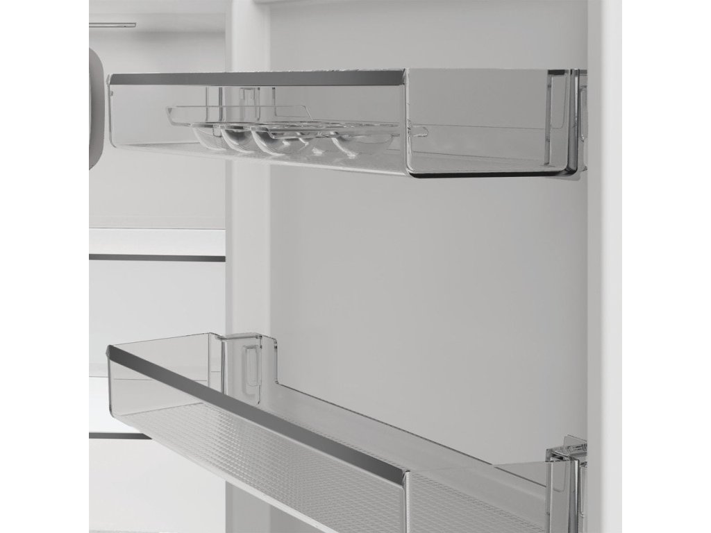 Kovová zadní stěna podporuje rovnoměrnou cirkulaci chladného vzduchu a rychlé obnovení teploty po otevření dveří. Výsledkem je efektivnější chlazení, menší energetické ztráty a delší čerstvost potravin.