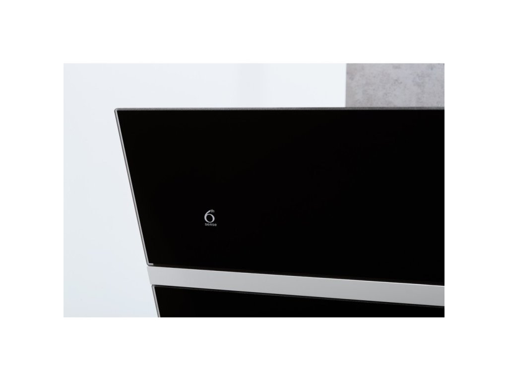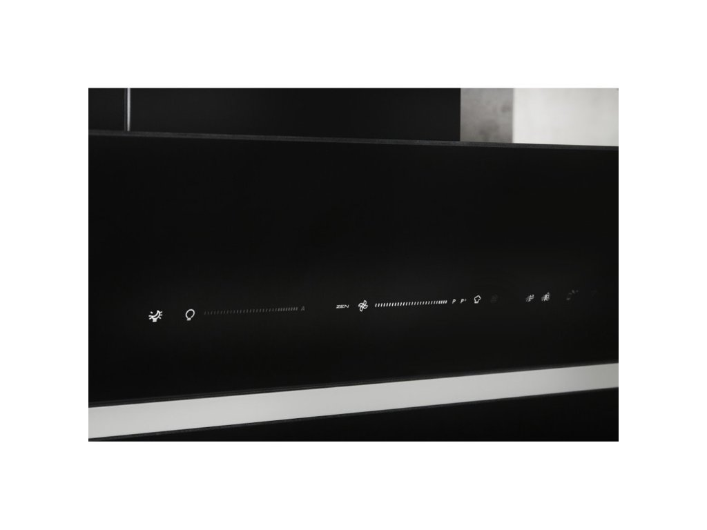 Komínová digestoř, černá, maximální výkon 240 až 801 m3/hod., energetická třída A++, LED osvětlení, 10 rychlosti, časovač, možnost recirkulace, šířka 90 cm.
