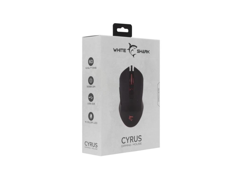 White Shark herní myš GM-3001 CYRUS má 6 tlačítek pro rychlou akci během hraní. Vybaveno optickým senzorem INSTANT A704, až 3200 Dpi. Nastavitelné tlačítko DPI umožňuje plynulé přepínání mezi 1200/1600/2400/3200 DPI a poskytuje správnou přesnost pro každou hru. 4 barevné LED osvětlení. Tělo této myši je vyrobeno z odolného plastu a povrchová úprava je pogumována.. Optický senzor na této myši sbírá vzorky 125krát za sekundu. Myš se k počítači připojuje opleteným kabelem o délce 1,8 m a rozhraním USB 2.0.