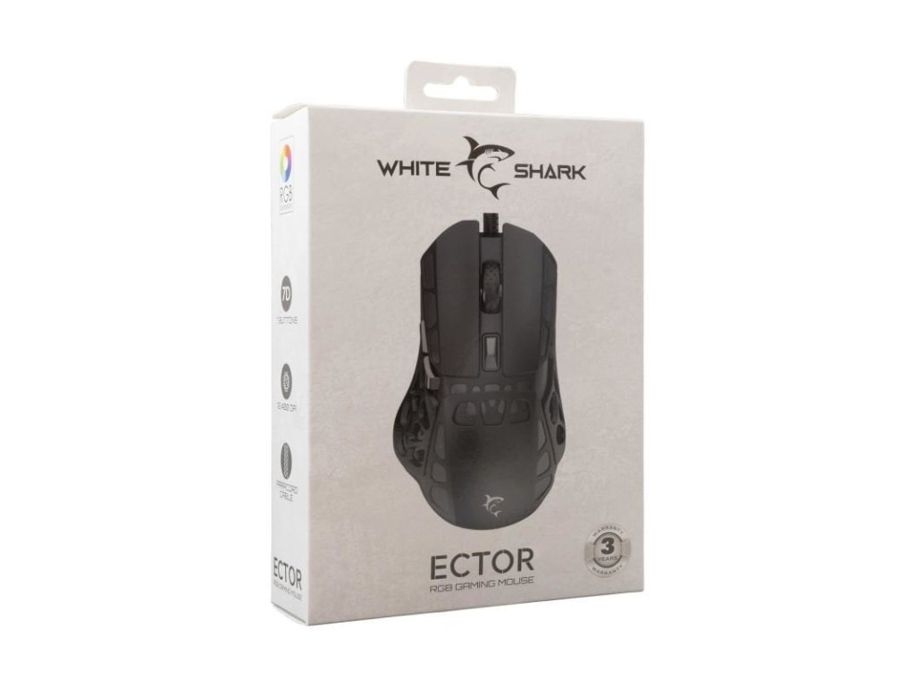 White Shark herní myš ECTOR je designována pro maximální herní výkon a pohodlí. 7D tlačítek, RGB osvětlení, HUANO spínače.