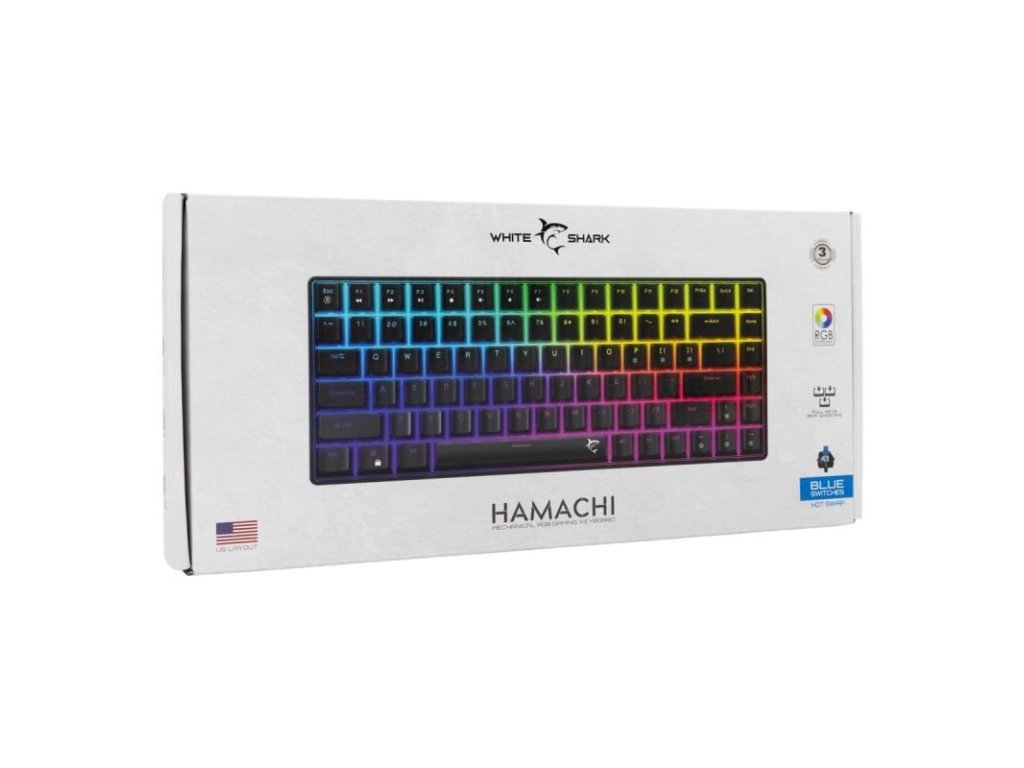 White Shark herní mechanická klávesnice HAMACHI, RGB, modrý switch, US layout nabízí skvělý herní zážitek díky rychlé odezvě a kompaktnímu designu.