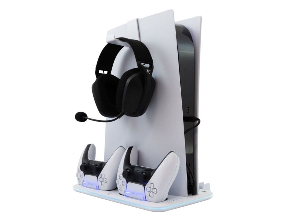 Mutlifunkční stojan pro Sony PlayStation 5, funkce stojanu/chladiče/nabíjecí stanice pro ovladače, rychlost ventiáltorů až 5000 ot./min, úložný prostor pro 15 PS5 disků, bílý/černý