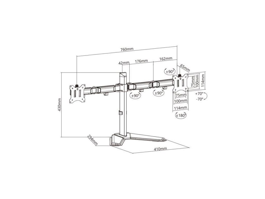 Držák pro 2 monitory, nastavitelná výška, montáž VESA (75x75 mm/100x100 mm), nosnost 9 kg na monitor, pro monitory až 32”