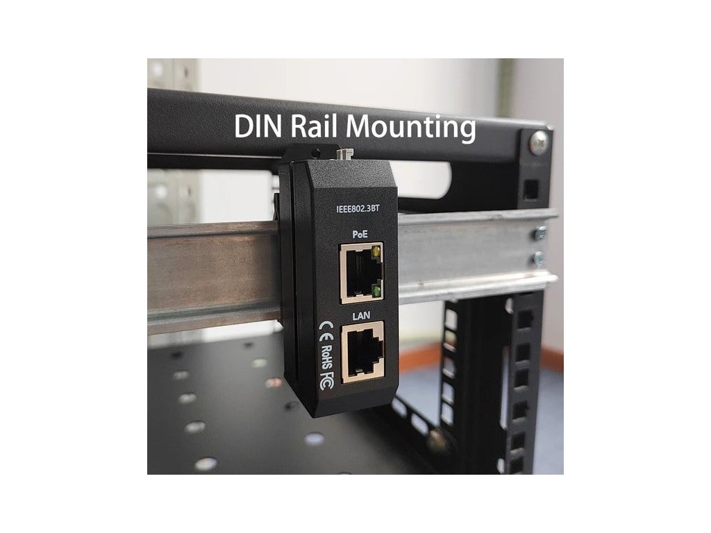 PoE injektor 802.3af/at/bt s výkonem 90 W, rychlostí až 2,5 Gb/s, podporou 2,5/5/10G a montáží na DIN lištu.