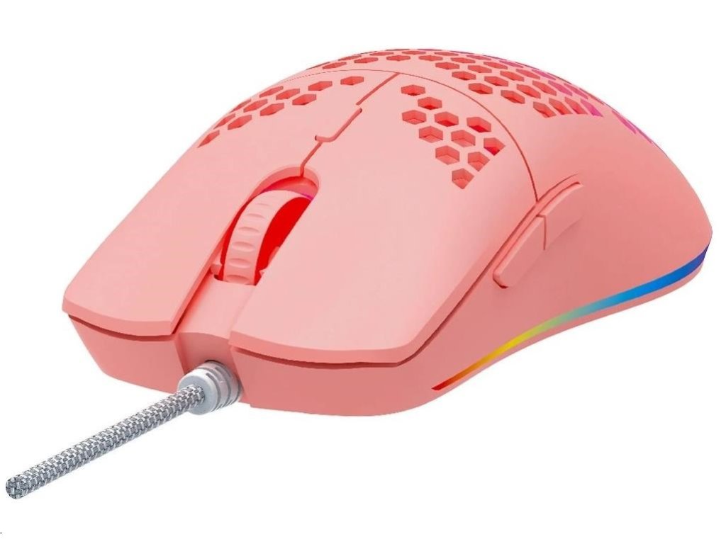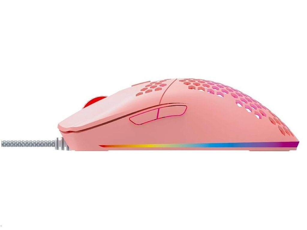 Herní myš, drátová, optická, délka kabelu 1,8 m, 1000-7200 DPI, 6 tlačítek, 4 profily, RGB podsvíecní, růžová