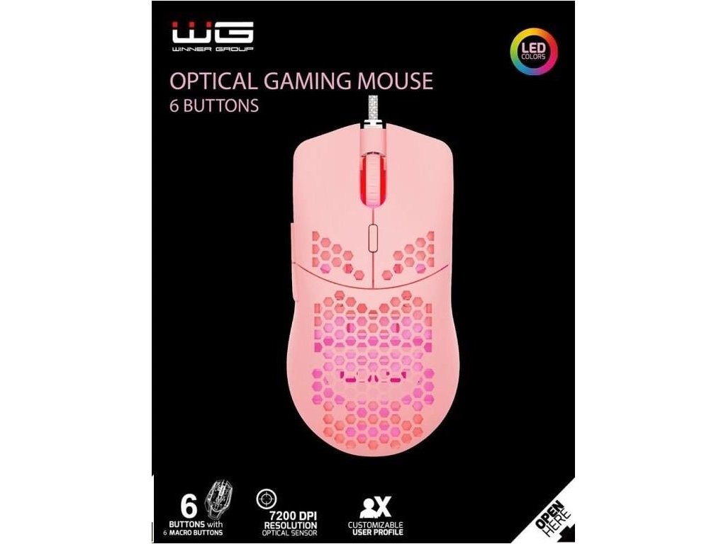 Stylová růžová herní myš WG2 s přesným optickým senzorem a nastavitelným 1000–7200 DPI pro plynulé ovládání ve všech hrách. Ergonomický design, RGB podsvícení, 6 tlačítek a možnost uložit až 4 profily nastavení dělají z této myši skvělou volbu pro každého hráče.