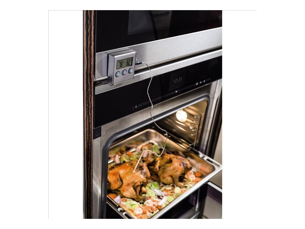 - digitální teploměr pro kontrolu vnitřní teploty jídla při vaření, pražení, pečení - senzor z nerezové oceli (16 cm) s kabelem odolným vůči vysokým teplotám (1 m) umožňuje měření teploty uvnitř tepelně upravovaných potravin - vhodný pro zeleninu, pečené maso, koláče, steaky, polévky, víno, vodu na horké nápoje, jídla pro miminka apod. - pro sledování různých stupňů vaření při nastavení specifické teploty: alarm upozorní na to, že nastavená teplota byla překročena a zabrání tak, aby bylo jídlo převařené - lze použít jako časovač nebo teploměr; časovač lze nastavit na max. 99 minut a 59 sekund (možnost odpočítávání nahoru nebo dolů) - vhodný pro nepřetržité použití, např. pro celou dobu pečení (senzor zapíchnutý v mase v troubě a teploměr venku) - odolné provedení, různé možnosti připevnění, např. pomocí magnetu, očka na zadní straně nebo stojánku - rozlišení: 1°C Obsah balení: - 1 digitální teploměr na potraviny - 1 kabelový senzor - 1 AAA Micro baterie - návod k použití Informace pro uživatele: Doporučujeme mytí senzoru ručně. Nedoporučujeme mytí v myčce na nádobí, aby se zabránilo nepřesným výsledkům při měření. Samotný teploměr otřete vlhkou utěrkou. Upozornění: Teploměr nemá funkci automatického vypnutí. Pokud ho chcete vypnout, vyjměte baterii. Signál oznamující dosažení nastavené teploty vypnete vytažením sondy z pokrmu/nápoje. Parametry Displej/indikátor Digitální Materiál Nerez | Plast Měřící rozsah -10°C až +250°C Rozlišení 1 °C Produktová řada Kuchyň a domácnost Použití Teplota nápoje | Teplota pečeného pokrmu | Trouba Značka XavaxDoplňkové parametry
