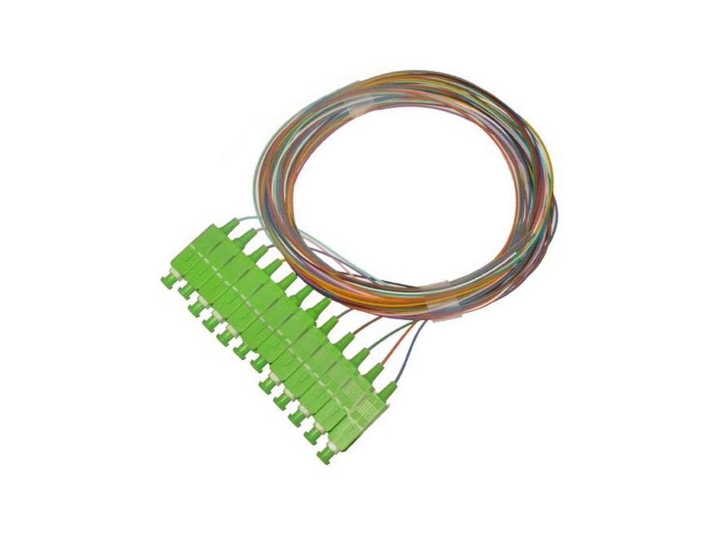 Jednostraně konektorovaná sada 12 optických kabelů (pigtail) s koncovkou SC, single mode 9/125 um, délka 1m, sekundární ochrana průměr 0,9mm. Broušení konektoru APC. Odraz menší než 60 dB.