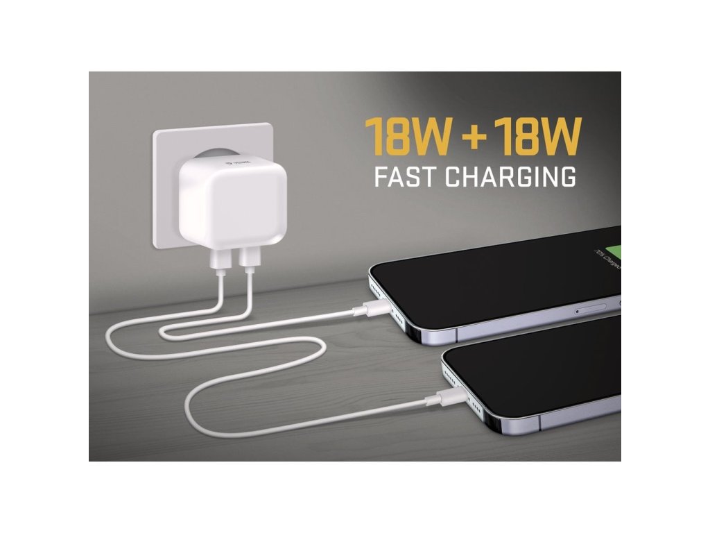 YENKEE YAC 2133 Duální USB-C nabíječka 36 W, Kompaktní duální USB C nabíječka s maximálním výstupním výkonem až 36 W vhodná pro rychlé nabíjení mobilních telefonů a tabletů. Nabíječka je vybavena technologií rychlého nabíjení Power Delivery.