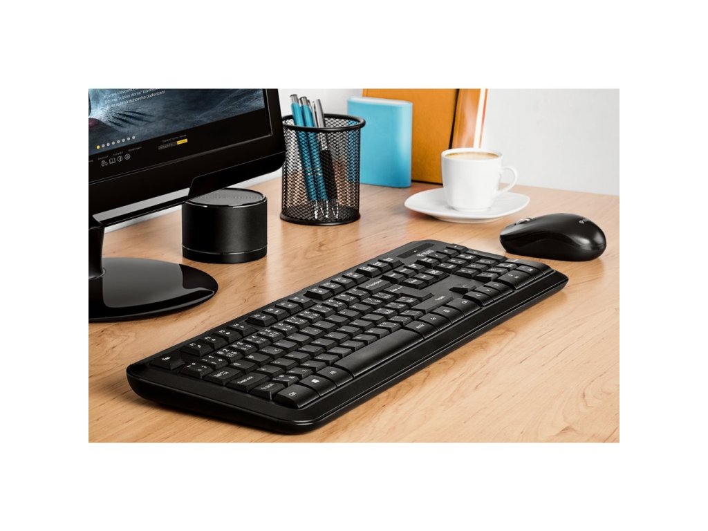 Sada bezdrátové klávesnice a myši je perfektní řešení pro domácí i kancelářské použití. Kompaktní rozměry klávesnice a ergonomický design v kombinaci s tichými klávesami zajišťují perfektní pocit z psaní. Multimediální klávesy vám umožňují spouštět a ovládat některé nejpoužívanější aplikace stiskem jediné klávesy. Díky dlouhé životnosti kláves a odolnosti vůči polití je tato klávesnice nejlepším řešením pro použití doma i v kanceláři. Tato myš je vhodná pro leváky i praváky, a její citlivost lze nastavit až na 1 600 DPI. Bezdrátová provozní vzdálenost je až 10 metrů a tato sada je spojena s PC pomocí pouze jednoho nano přijímače. Baterie jsou součástí příslušenství.