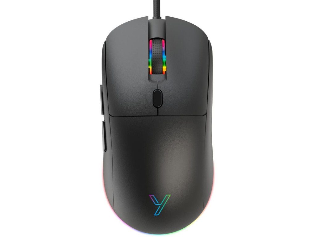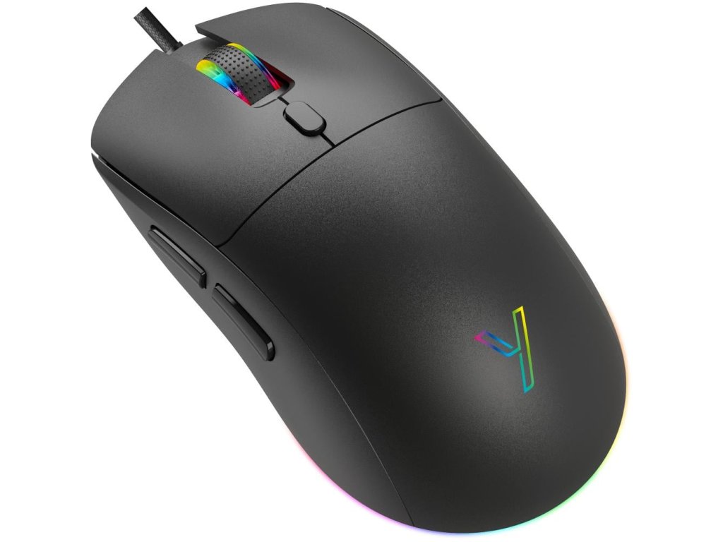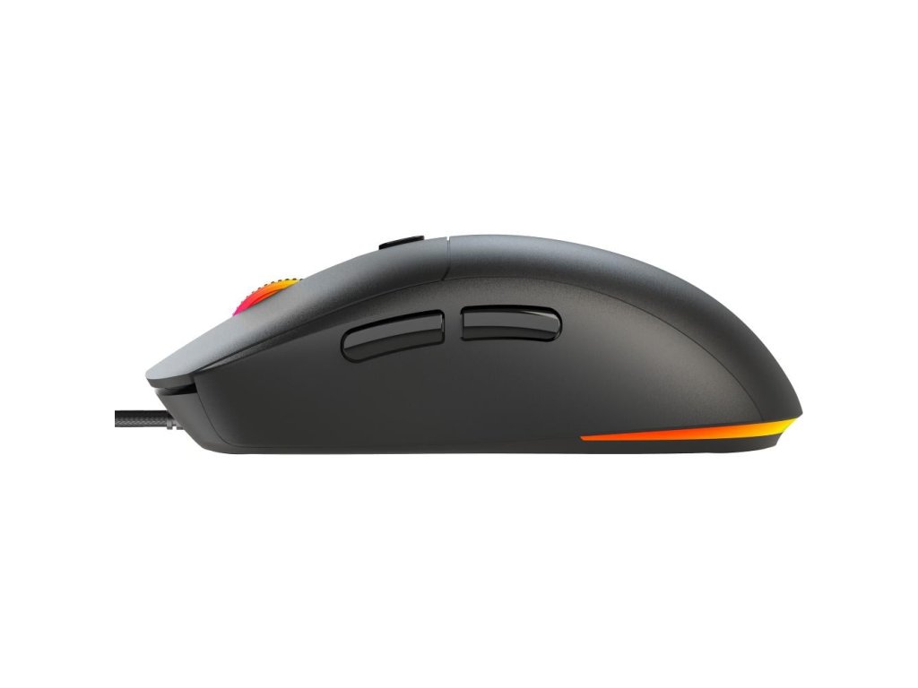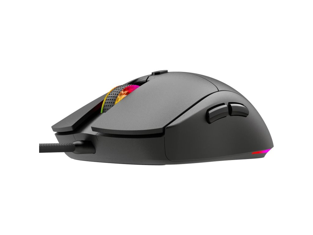 Drátová herní myš REAPER, hmotnost jen 69 gramů, symetrický tvar se dvěma bočními tlačítky na pravé straně, nastavitelné až 7200 DPI, barevné nastavitelné podsvícení, opletený kabel.