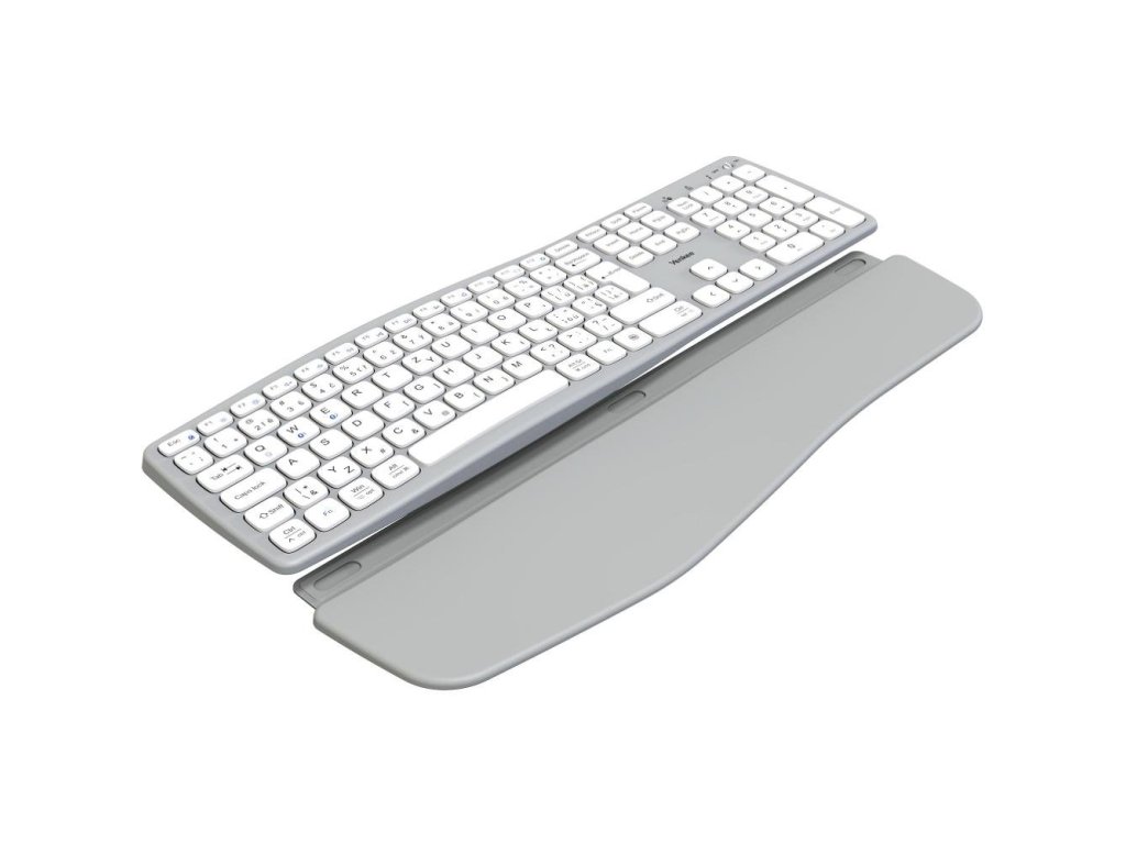 Bezdrátová ergonomická klávesnice: 2,4G + 2x BT, odnímatelná měkčená magnetická opěrka rukou, tiché nůžkové spínače, dobíjecí baterie (110h), USB-C, ultratenký profil 20 mm, nastavitelná výška