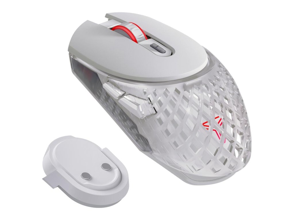 Unikátní myš AURA je osazena pokročilým optickým senzorem Pixart 3335, který disponuje 15000 DPI, akcelerací 40G a Polling Rate až 1000Hz. Tyto vlastnosti lze nastavit v programu, který je k myši k dispozici, společně s jejím podsvícením. Program též nabízí možnost programování jednotlivých tlačítek a jejich funkcí, lze si tak myš upravit zcela individuálně aby vyhovovala vaším specifickým potřebám. Perforované tělo myši ji dělá lehkou a vzdušnou, zároveň jí propůjčuje ojedinělý vzhled a pocit v ruce. Skrz vzor horního krytu myši lze vidět podsvícené logo značky, svítí i středové kolečko myši. Bezpochyby největší předností myši je konektivita spojená s nabíjením myši, tedy její magnetická dokovací stanice, která působí rovněž jako přijímač 2.4G, není tedy třeba již připojovat další USB přijímač nebo další kabely. V případě, že si však myš chcete vzít s sebou bez nabíjecí stanice, máte možnost připojení přes Bluetooth, nebo klasickým USB-C kabelem do předního konektoru myši, čímž se bude zároveň i nabíjet. Dokovací stanice disponuje spodní výsuvnou krytkou, kterou lze připevnit ke stolu či dokonce na zeď. Stanice tak bude bezchybně pevně držet, zároveň ji lze v případě potřeby vysunout a vzít si bez problému s sebou. Integrovaná baterie o kapacitě 500mAh nabízí až 50 hodin nepřetržitého používání, díky magnetickému nabíjení se pak zvládne nabít znatelně rychleji než přes klasický konektor.