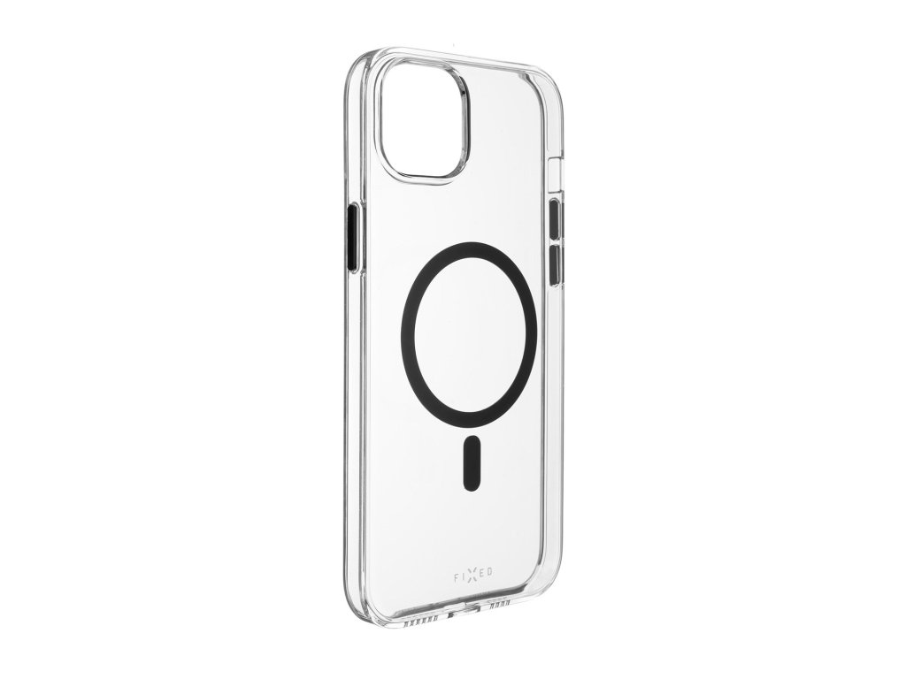 Plně průhledné provedení FIXED MagPurity je doplněno černými detaily v podobě kovových krytek ovládacích tlačítek a MagSafe kruhu na zádech krytu.