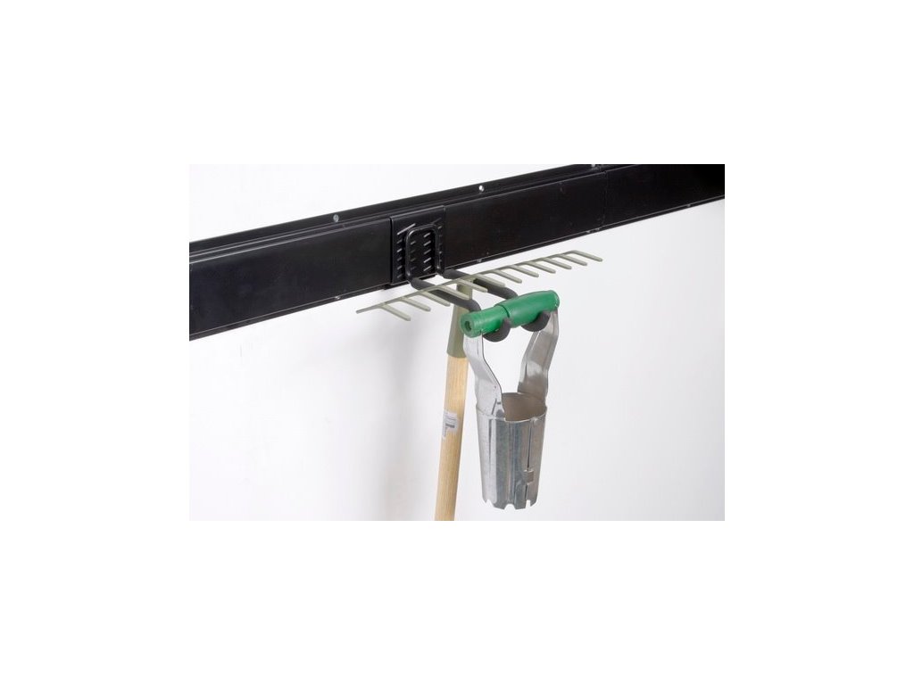 Držák na nářadí je jednoduchý na připevnění a umožní bezpečné zavěšení téměř každého druhu nářadí. Je opatřen gumovým návlekem a zavěšuje se na závěsnou lištu s rozměrem 61 x 10 cm, kterou lze spojovat spojnicí a zakončit plastovou záslepkou.